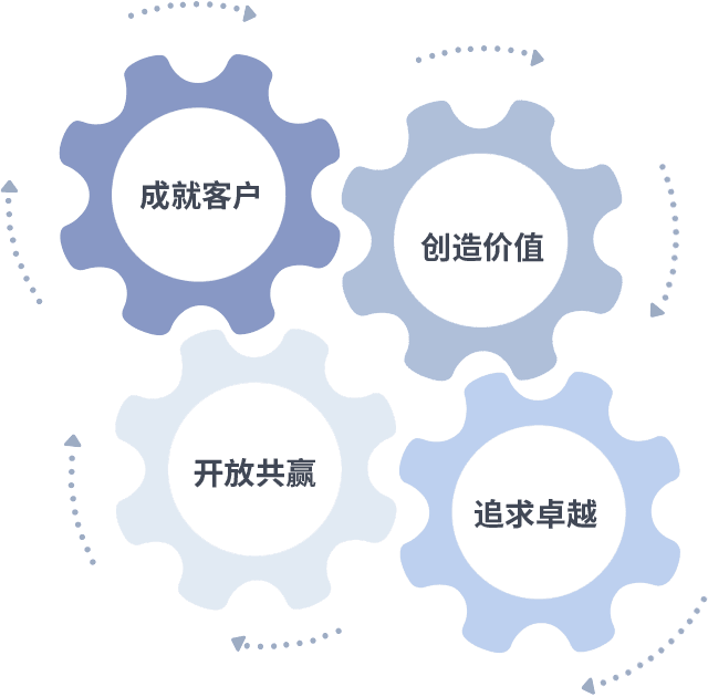 成就客户是一切决策的出发点,,,,创造价值是衡量所有工作的标准,,,,追求卓越是我们做事做人的态度,,开放共赢是我们的格局也是最终的结果。。。。价值观的齿轮环环相扣,,,推动着组织里的每个人不断向前。。。
