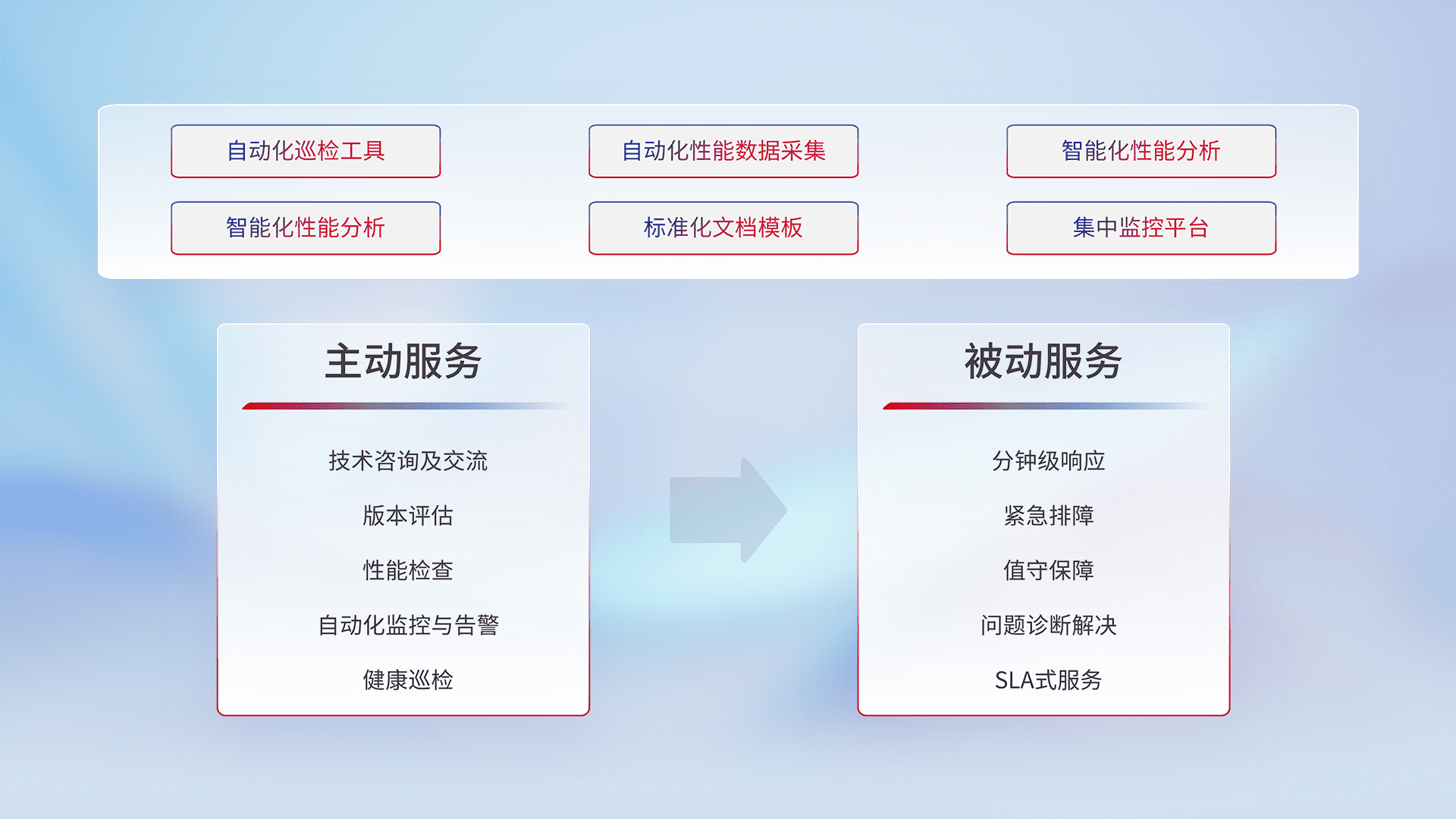 智能化工具和标准化文档,,,保障服务质量,,提供主动服务(包含技术咨询、、版本评估、、、、性能检查、、、、自动化监控与告警、、、健康巡检)和被动服务包含(分钟级响应、、、紧急排障、、、值守保障、、、问题诊断解决、、、、SLA服务)。。